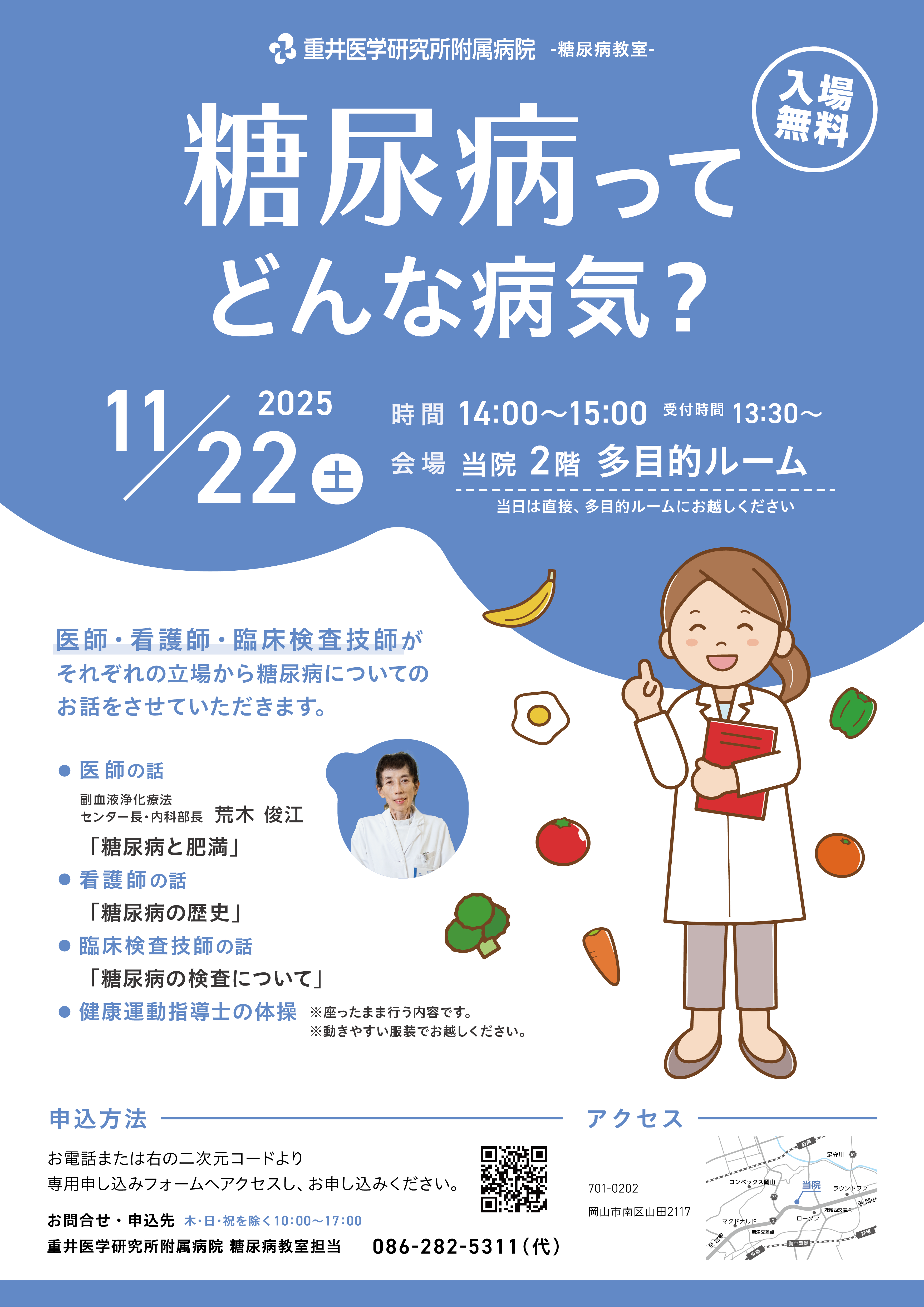 | 内容: | 医師の話 「糖尿病と肥満」 看護師の話 「糖尿病の歴史」 臨床検査技師の話 「糖尿病の検査について」 健康運動指導士の体操 |