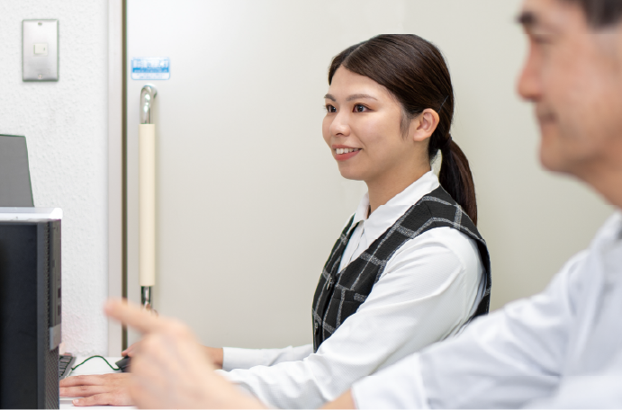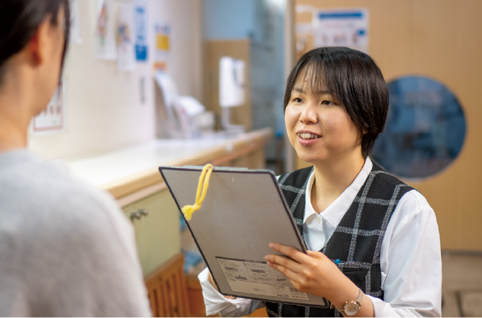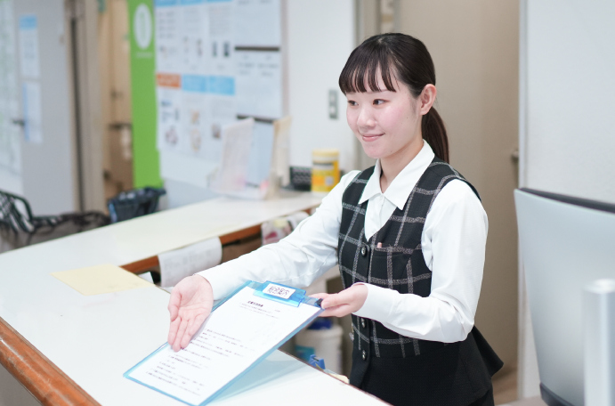 患者さんが来院し最初に訪れるのは受付です。患者さんが安心して過ごせるよう、落ち着いた声かけや分かりやすい説明で対応します。診察受付・案内のほか会計業務、文書依頼の受付、来客対応なども担当します。