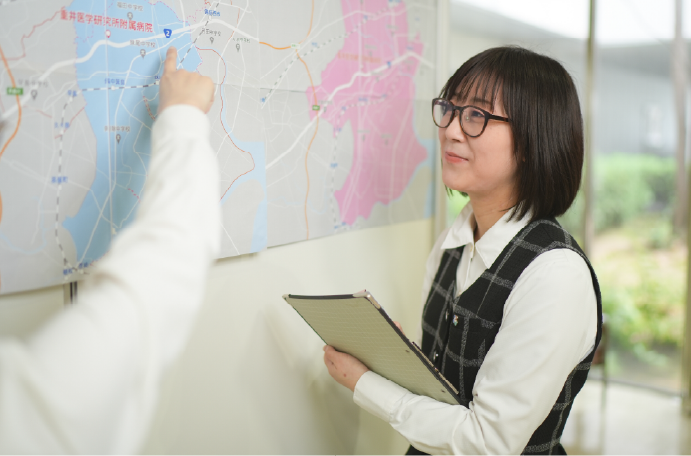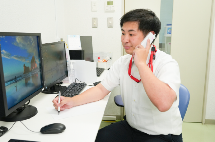 他院からの紹介や検査・入院の予約を受け、医師との予定を調整したり、当院の患者さんが他院を受診する際の予約をしたりしています。また、他医療機関や介護施設などとの連携の窓口となっており、地域の連携を深める取り組みの企画運営にも携わっています。